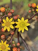 - Elementos africanos. Os géneros Aeonium e Aichryson, ambos quase restritos à Macaronésia (com excepção de duas espécies de Aeonium na África Oriental), chegaram à Madeira por via das Canárias, onde evoluíram a partir de antepassados herbáceos norte-africanos. O Aeonium glutinosum é um dos muitos exemplos de caulirrosulada na flora madeirense: é uma planta lenhosa e as folhas concentram-se em rosetas nas extremidades dos ramos. Também o famoso dragoeiro (Dracaena draco) é um caulirrosulado insular de origem africana. Os géneros Aeonium e Sideroxylon, distribuídos em ambas as margens do continente africano, pertencem a um cortejo de taxa designado Rand Flora. Na flora pteridófita madeirense há espécies claramente africanas: tanto o Asplenium monanthes como o Asplenium aethiopicum têm distribuições alargadas em África; e a Arachniodes webbiana, endémica da Madeira, tem uma irmã na África do Sul, Arachniodes webbiana subsp. foliosa. O género macaronésico Phyllis, composto por duas espécies, só uma delas presente na Madeira, tem fortes afinidades com vários géneros sul-africanos.